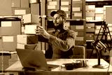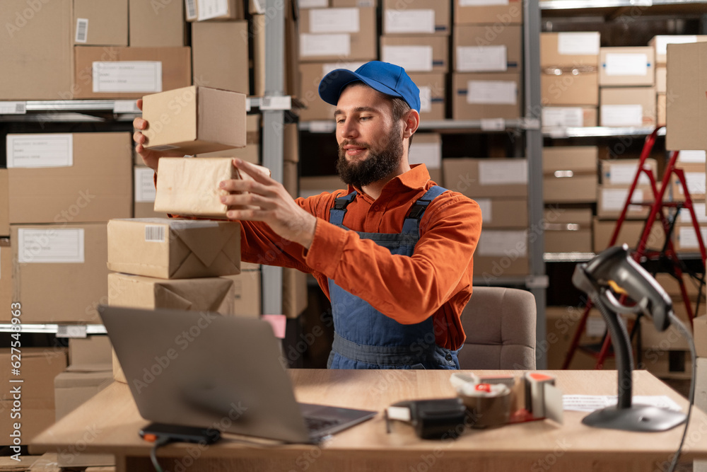 Male warehouse worker checks stock and inventory on laptop computer in the retail storeroom full of shelves with goods. Working in logistics and distribution center