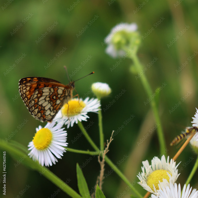 False heath Fritillary butterfly on fleabane daisy flowers. Melitaea diamina on Erigeron annuus flowers