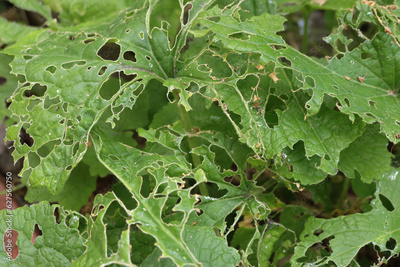 Close-up of green Lunaria annua or Honesty plant damaged by slugs on summer