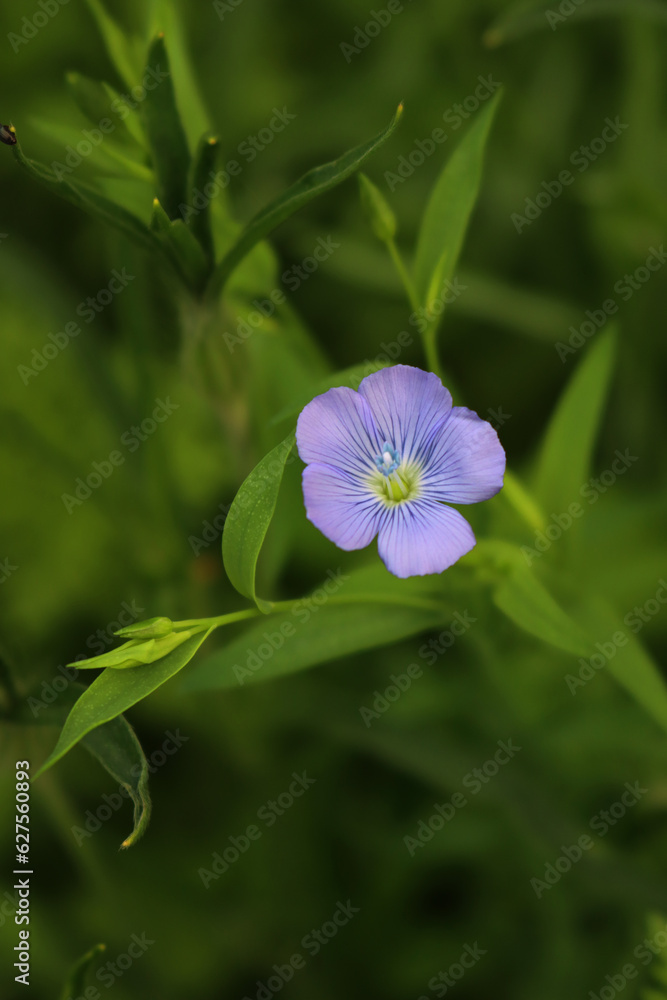 Close-up of blue Flax flower on plant. Linum usitatissimum