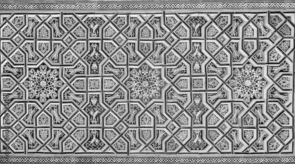 Geometric traditional Islamic ornament. Fragment of a ceramic mosaic. Black and white.
