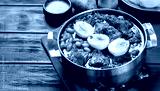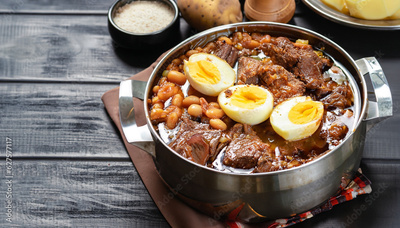 close-up of Traditional Jewish Cholent (Hamin) - main dish for the Shabbat meal slow cooked beef with potato, beans and brown eggs in a metal casserole on a black wooden table