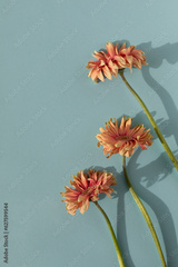 Beautiful coral gerbera flowers with aesthetic sunlight shadows on blue turquoise background top view. Floral minimalistic composition in flat lay style