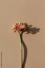 Single coral gerbera flower with aesthetic sunlight shadows on neutral beige background top view. Floral simplicity composition in flat lay style