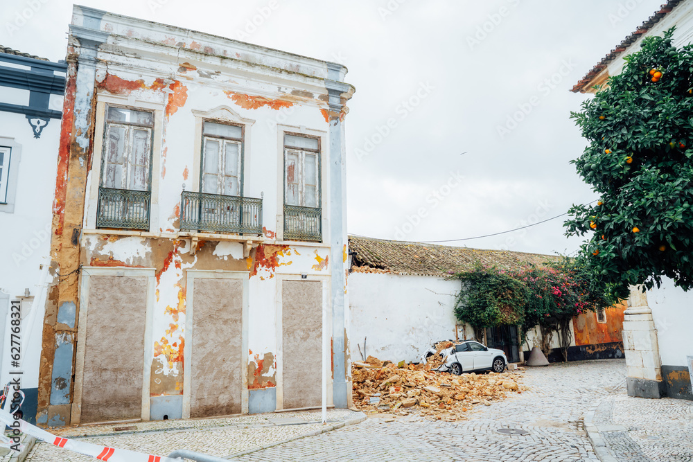Traditional Mediterranean style residential building in dangerous emergency condition with a pile of ruins collapsed on the nearby car. Need to demolish, dismantle emergency constructions.