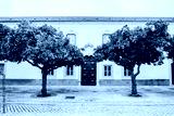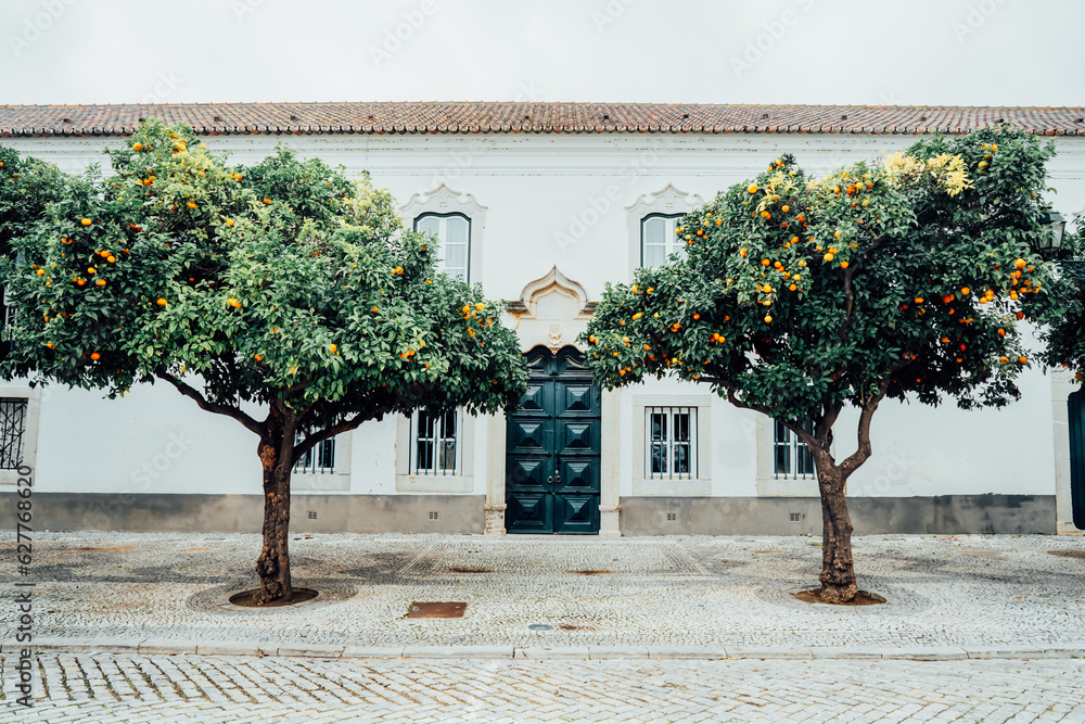 Orange trees against traditional Mediterranean city house building. Traditional urban exterior. Faro, Portugal. Selective focus.