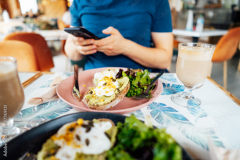 Focus on Healthy avocado toast with poached eggs, seeds and green salad on the plate with blurred young man using his phone during his breakfast in the hotel restaurant. Selective focus, copy space