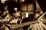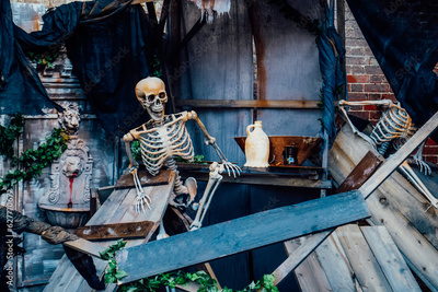 Outdoor Decor for Halloween. skeletons climbing out of the different wooden rubble. Halloween scenery. Terrible holiday photo zone on location for event. Traditions and decorations. Selective focus.