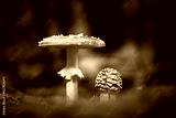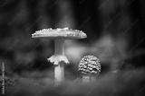 Fly agaric (Amanita muscari) red-headed hallucinogenic toxic mushrooms in dark forest close up