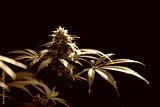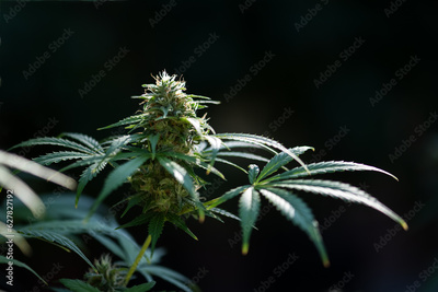 Cannabis bush on dark background. Fresh green leaves of marijuana close up. Medical marijuana growing concept