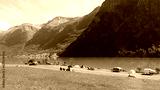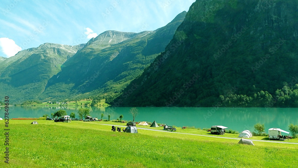 Norwegian landscape with green lake Oldevatnet in Oldedalen valley. Camping in Olden by lake Oldevatnet, Norway.