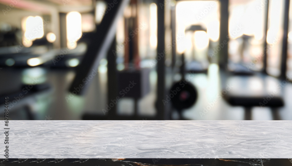 Empty black marble stone table top on blurred with bokeh Exercise room, fitness and gym interior background - can be used for display or montage your products