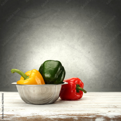 Red, green and yellow in a metal bowl on wooden kitchen table with gray grunge wall.