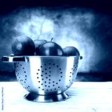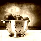 Red apples in a metal colander on wooden kitchen table with gray grunge wall.