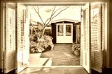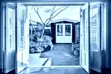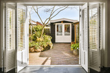 an open front door with shutters on the outside and trees in the yard behind it, as seen from inside