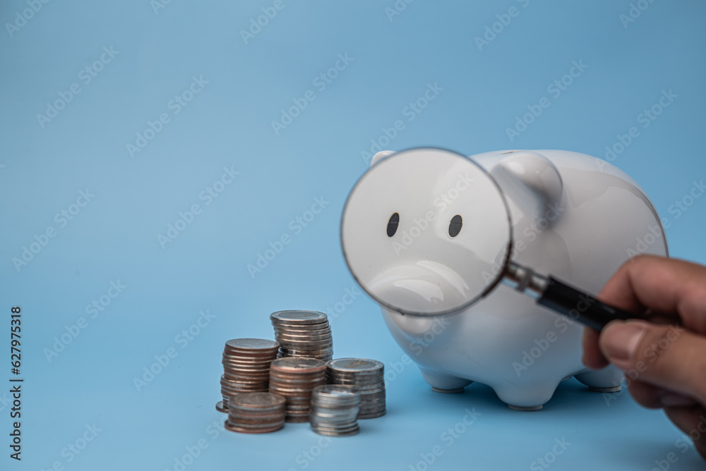 Saving Money with a Piggy Bank and a Magnifying Glass. Business financial prosperity and wealth accumulation