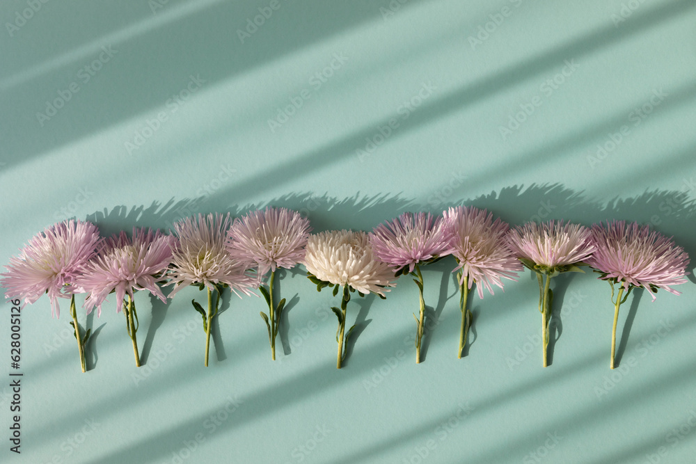 Bouquet of aster flowers with aesthetic sunlight shadows on mint turquoise background top view. Floral minimalist composition in flat lay style