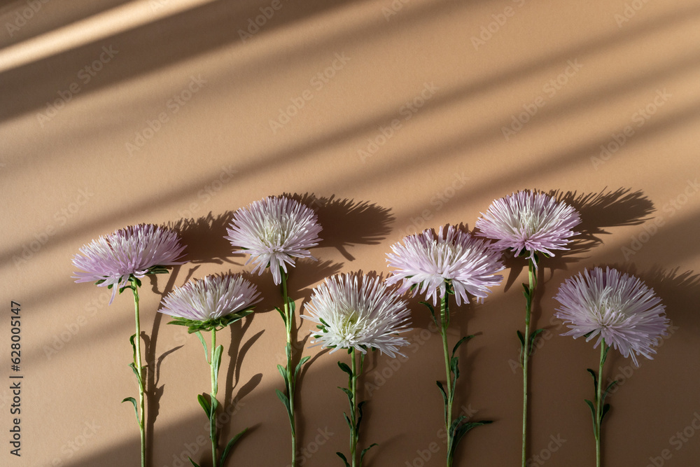Beautiful autumn aster flowers with aesthetic sunlight shadows on neutral beige background top view and flat lay. Floral minimalist still life