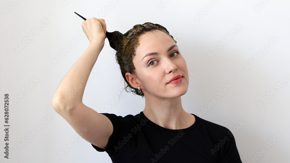 A young woman dyes her hair with an herbal mixture of henna and basma to produce a brown color