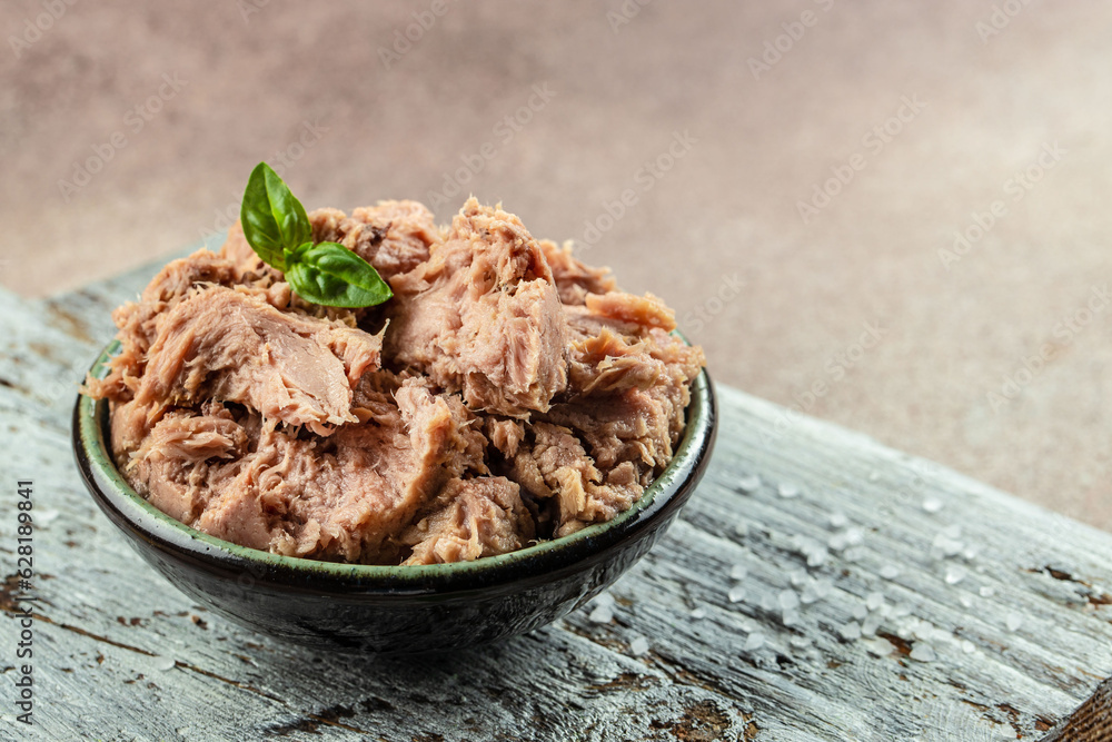 Canned tuna meat in a bowl on a wooden board. place for text, top view