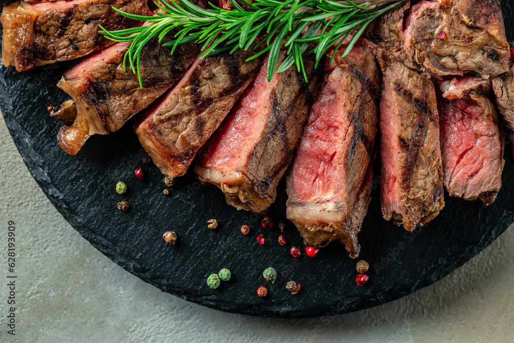 Grilled beef steak medium rare on a dark background. Long banner format. top view