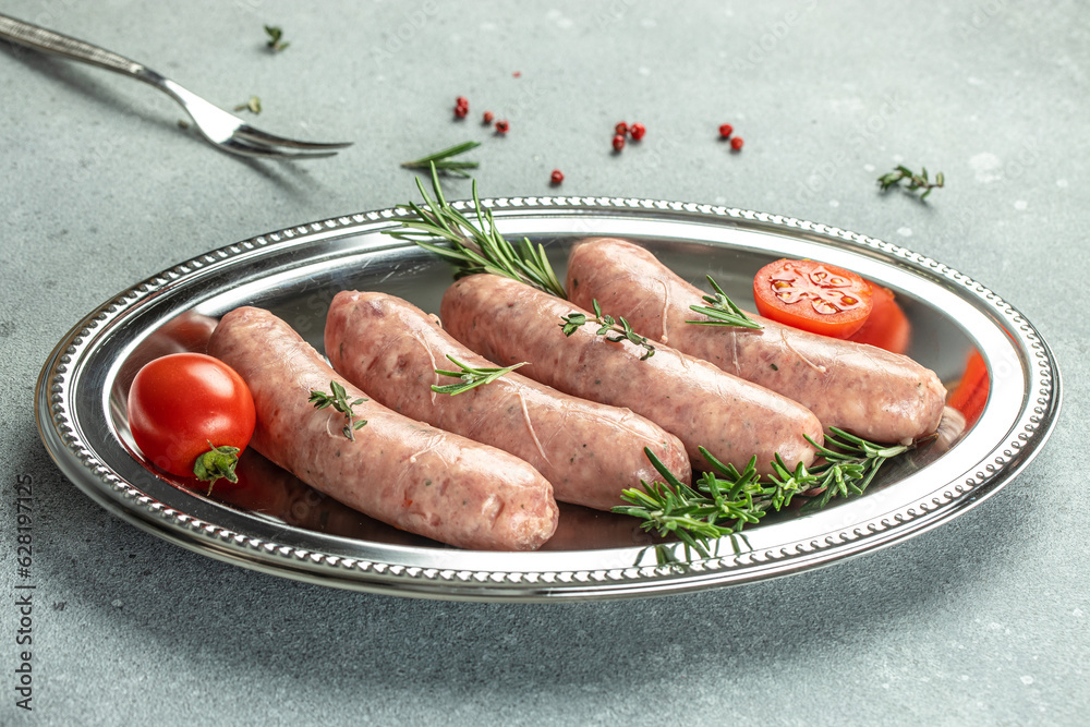 raw butchers sausages in skins with spices, tomatoes and herbs. banner, menu, recipe place for text, top view