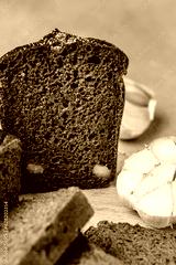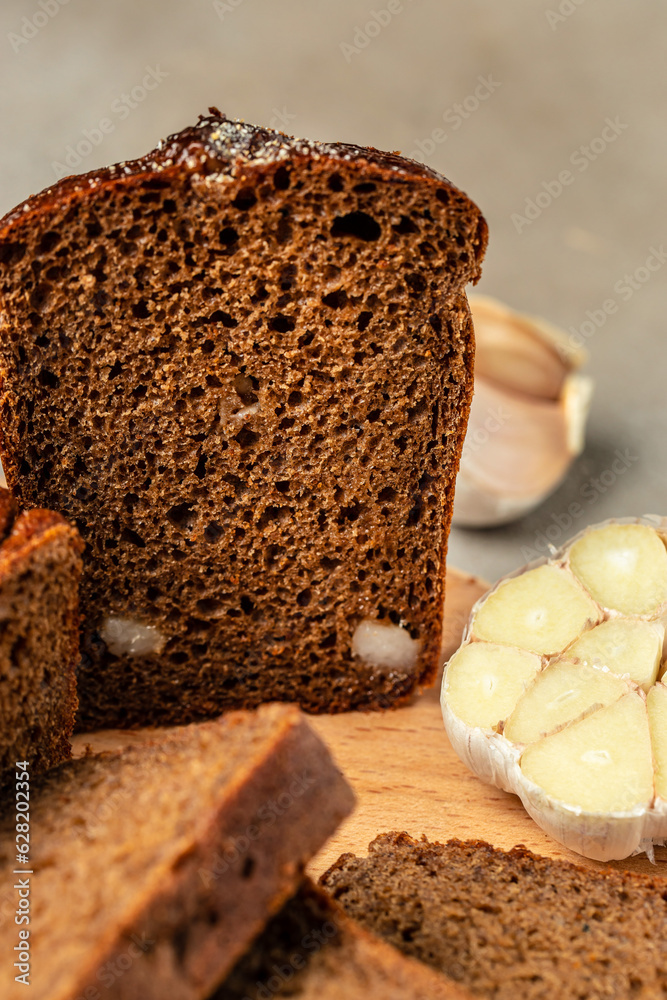 dark multigrain bread on the wooden board with garlic, Concept healthy and balanced eating. place for text, top view