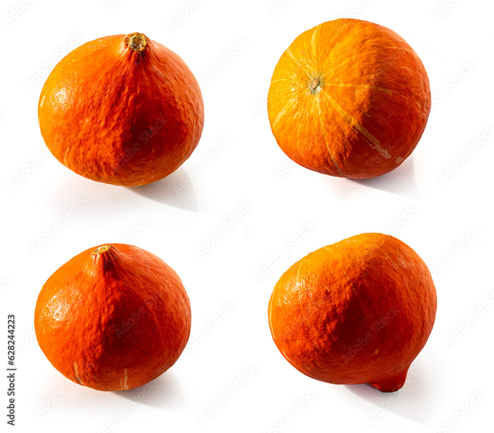 Red kuri squash pumpkin on a white isolated background. Winter potimarron squash orange vegetable autumn fruit for food health benefits, or Halloween decoration or a Thanksgiving