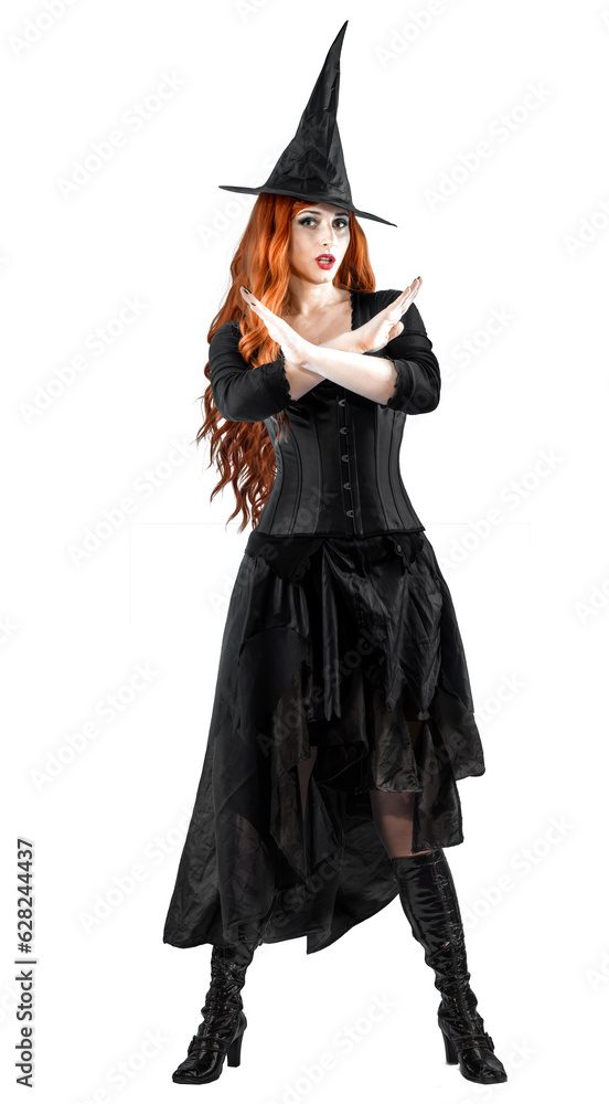 Witch on Halloween. Female wizard fairy character for All Saints' Day. Fantasy gothic red-haired Vampire girl in black dress. Enchantress dressed in carnival costume