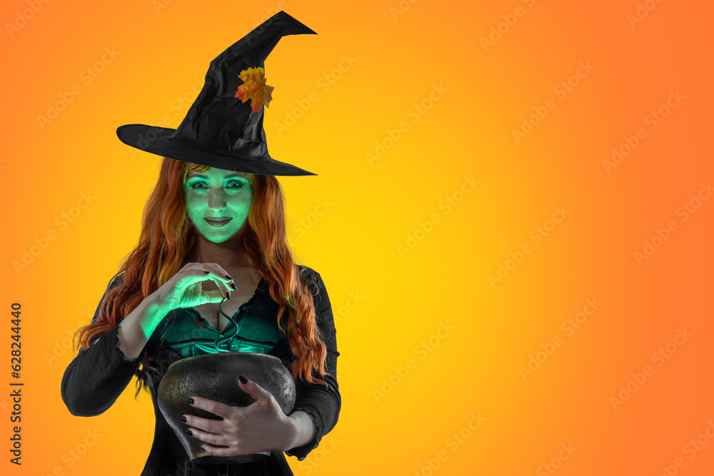 Witch on Halloween. Female wizard fairy character for All Saints' Day. Fantasy gothic red-haired Vampire girl in black dress. Enchantress dressed in carnival costume