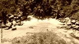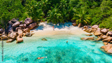 Anse Lazio Praslin Seychelles, a young couple of men and women on a tropical beach during a luxury vacation in Seychelles. Tropical beach Anse Lazio Praslin Seychelles