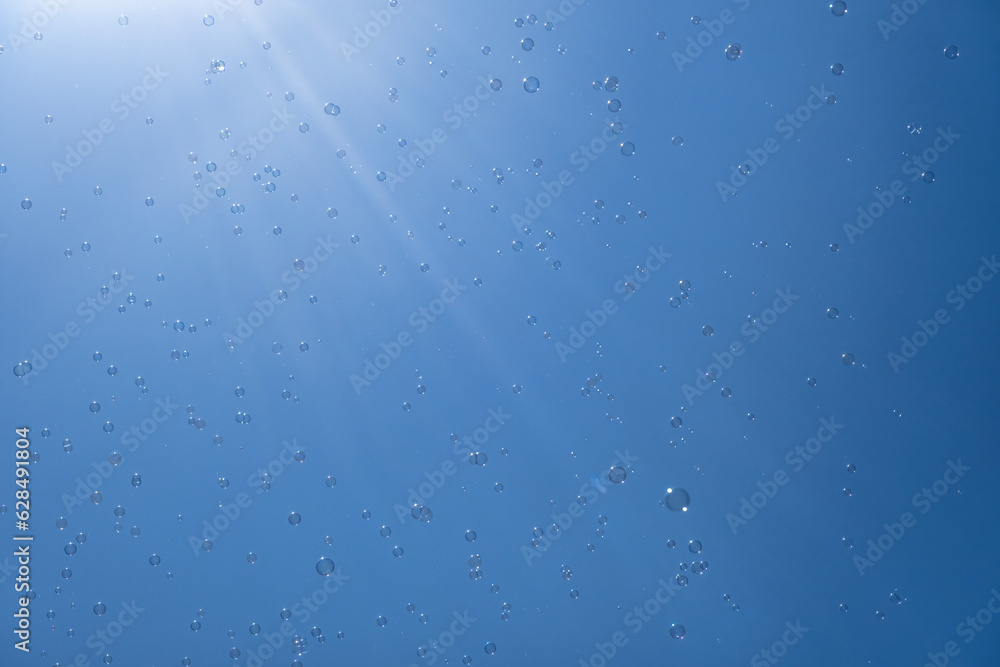 Soap bubbles in the blue sky. Beautifully iridescent balls of soap foam in the air with the rays of the sun