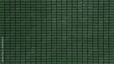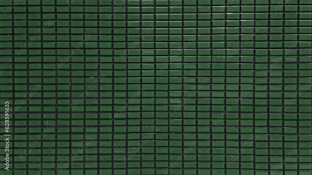 close up dark green colored mosaic wall tiles. ceramic tiles in rectangle pattern, emerald colored. vintage green mosaic kitchen wall pattern used as background.