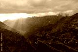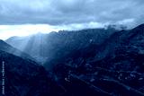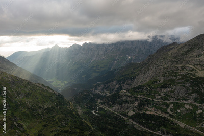 Drone view of majestic Swiss alps with green grass under cloudy sunset sky during sundown time in Switzerland.