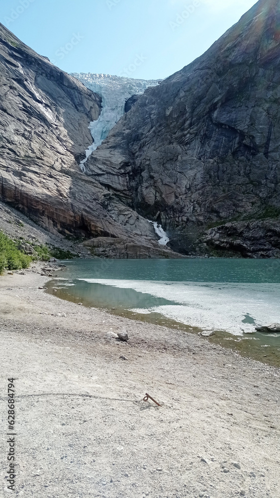 Briksdalsbreen Glacier in Olden, Nordfjord, Norway. The lake formed as a result of the melting of a glacier.