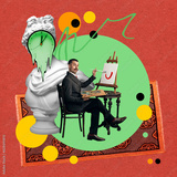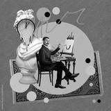 Handsome young man in image of famous painter making masterpiece. Abstract design. Contemporary art collage. Concept of eras comparison, creativity, retro style, classic and modern art