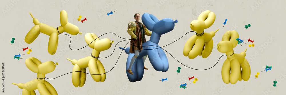 Man in image of royal person, prince or kind rising on giant toy dog over light background. Banner. Contemporary art collage. Concept of eras comparison, creativity, modern art