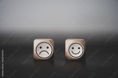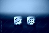 Smile face and sad face on wooden block cube to rate satisfaction. Concept of deciding whether to like or dislike. Mindset selection.