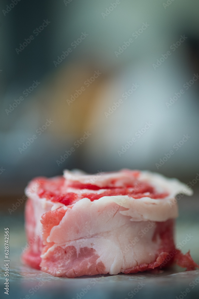 Premium rare slices of beef looks like flowers in the restaurant look appetizing served for Sukiyaki and Shabu.