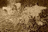 A lake in the shape of the world's continents in the middle of untouched nature. A metaphor for ecological travel, conservation, climate change, global warming and the fragility of nature.3d rendering