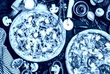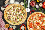pizza with ham, mushrooms and cheese on a dark background, Fast food lunch. top view. place for text