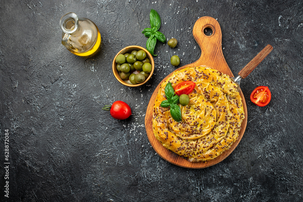 homemade snail pie with meat. Turkish cuisine. top view. place for text