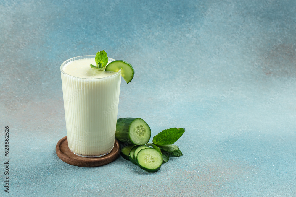 Homemade yogurt drink Ayran with fresh cucumber on a blue background, clean eating for weight loss. place for text