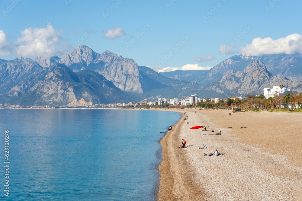 Picturesque beach with a small number of people relaxing on the sea coast in the distance amazing mountains