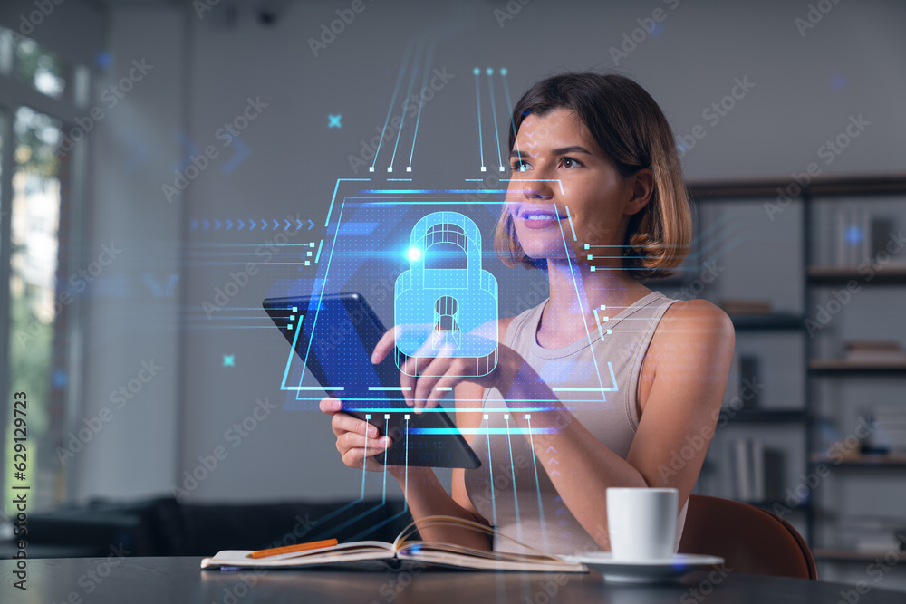 Smiling businesswoman in casual wear holding tablet device touching it at office workplace. Concept of distant work, business education, information technology. Lock icons hologram