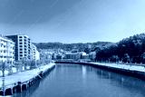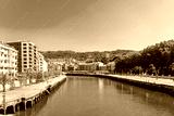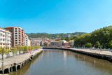 Bilbao, SPAIN - July 19 2022: Promenade area of the River Nervion. In background the old city of Bilbao in front plane the river Nervion. Travel destination in North of Spain, Basque Country