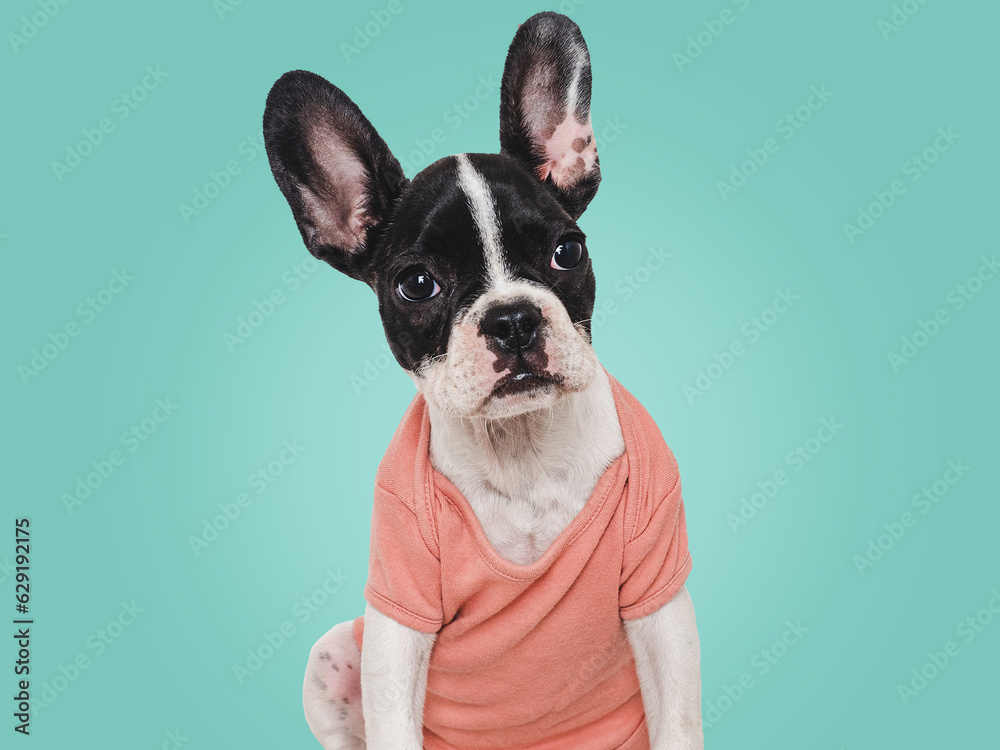 Cute puppy sitting on the table. Studio shot. Isolated background. Clear, sunny day. Close-up, indoors. Day light. Concept of care, education, obedience training and raising pets