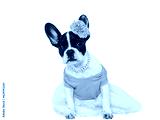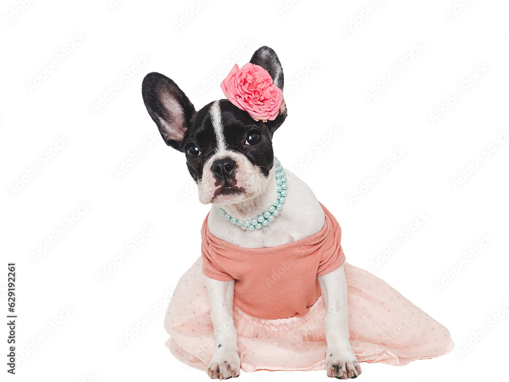 Cute puppy, beads, red t-shirt and dress. Studio shot. Isolated background. Clear, sunny day. Close-up, indoors. Day light. Concept of care, education, obedience training and raising pets