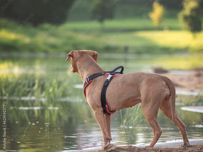 Cute dog on the river bank against the background of trees. Closeup, outdoor. Day light. Concept of care, education, obedience training and raising pets