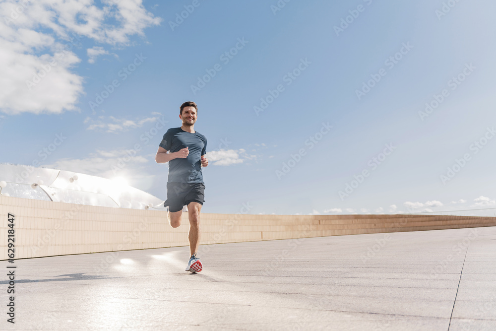 A runner is a young man in comfortable sports clothes for fast running. I train in full-length running shoes.